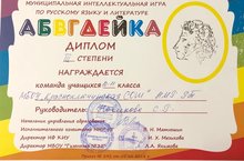 14 декабря команда 10-11 классов (руководитель Новикова С.Р.) приняла участие в Муниципальной интеллектуальной игре по русскому языку и литературе и заняла почётное III место. Поздравляем!