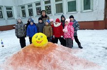 Родители совместно с детьми 1"Б" класса приняли участие в школьном конкурсе снежных скульптур. Из снега они следили снежную скульптуру под названием "Колобок".