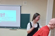 На занятиях кружка " Основы оказания первой помощи" ребята отрабатывают на манекенах правила оказания помощи при попадании инородного тела в дыхательные пути