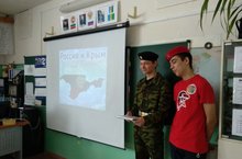В 7-8 классах прошёл классный час на тему "День воссоединения Крыма с Россией", провели его обучающиеся 10 класса Озернов Святослав (командир взвода школы) и Рахимов Айгиз (член отряда " Юнармия").