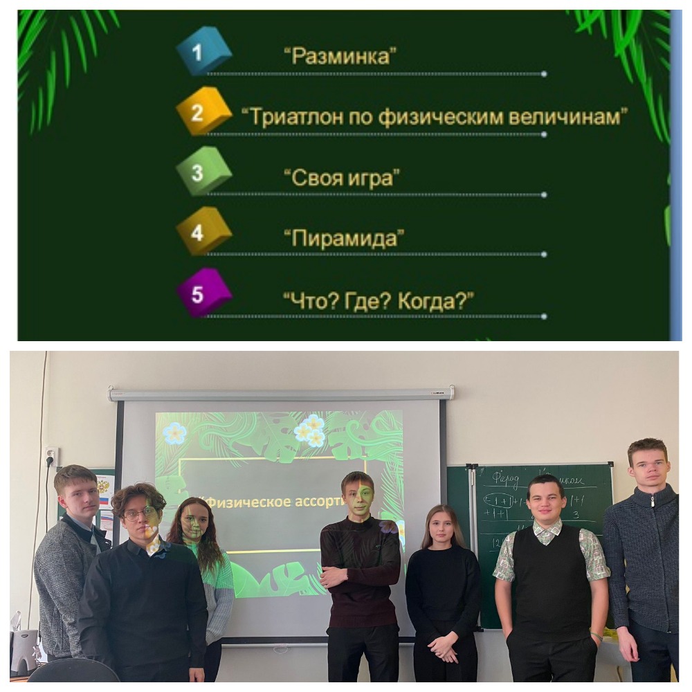 Сегодня для учащихся 11 классов прошла интеллектуальная игра «Физическое ассорти». Игра представляла собой ассорти из физических игр: «Разминка», «Триатлон по физическим величинам», «Своя игра», «Пентагон», «Что? Где? Когда?»Для выполнения заданий учащимся необходимо было проявить свою интуицию, смекалку, логически мыслить и проявлять находчивость.
