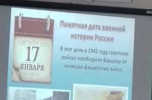 В 7 классе (классный руководитель Пестрова З.В.) прошел классный час на тему: «75 лет со дня освобождения советскими войсками Варшавы от немецко-фашистских войск». Учащиеся подготовили историческую справку о Варшавско-Познанской наступательной операции.