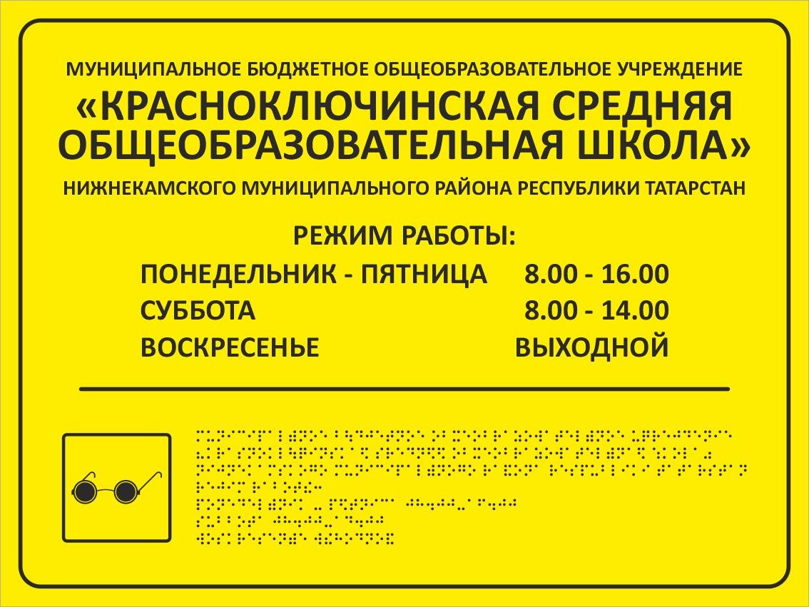 Информация о Красноключинской школе со шрифтом Брайля для слабовидящих людей у входа в школу