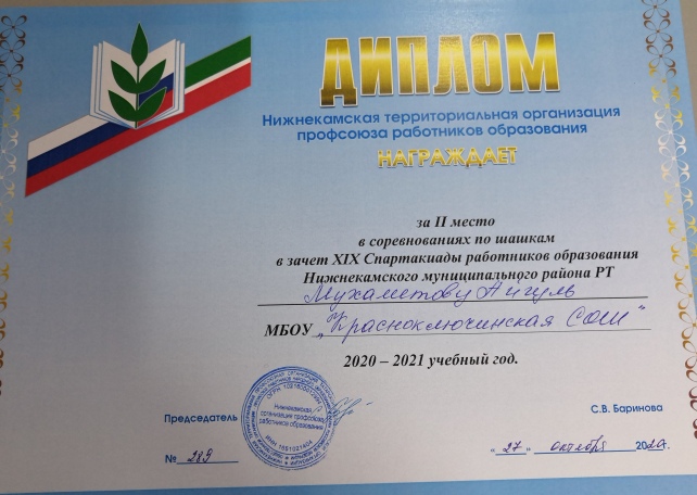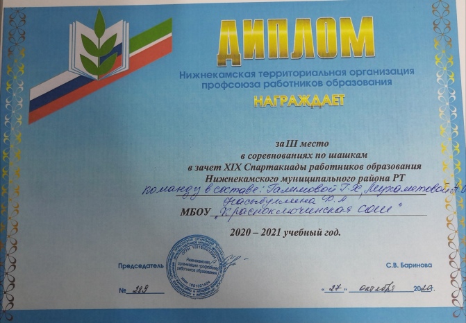Опубликовано: 10.11.20203 ноября 2020 года команда учителей Красноключинской школы в составе Насыбуллина Ф.А., Галимовой Г.Х. и Мухаметовой А.И. приняла участие в XIX Спартакиаде работников образования Нижнекамского муниципального района РТ по шашкам и заняла достойное 3 место! Поздравляем!!!![]()