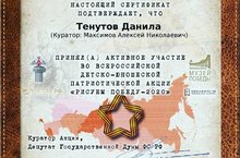 Кадет Тенутов Данила, ученик 5" А" класса, принял участие во Всероссийской акции " Рисуем победу». Куратор Максимов А.Н.. Более 27000 творческих работ из 2430 населённых пунктов нашей страны и 14 зарубежных государств было направлено для участия в Акции в этом году. Всероссийская детско-юношеская акция «Рисуем Победу» стала самой масштабной детско-юношеской онлайн-акцией, посвящённой 75-летию Победы в Великой Отечественной войне. Мы благодарим Данила и его наставника за участие и желаем творческих побед!