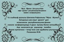 6 а сыйныф укучысы Шигапов Рафаэльны “Муса Җәлил - батырлык һәм иҗат үрнәге” дип исемләнгән республикакүләм фәнни-гамәли конференциядә 2 урын яулавы белән котлыйбыз.
