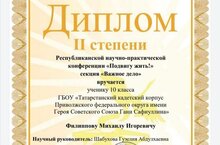 Поздравляем нашего воспитанника Филиппова Михаила, который принял участие в Республиканской научно- практической конференции "Подвигу жить!" в секции "Важное дело", и был удостоен Диплома II степени.
