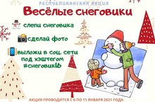 Республиканская акция "Веселые снеговики" - идея акции - пропаганда семейных ценностей, повышение роли семьи в организации социально-значимого досуга детей. Участниками Акции может стать любой житель Республики Татарстан, Российской Федерации независимо от возраста и места проживания и гражданства. Акция проводится с 6 по 11 января 2021. Обращаем внимание, что участие в акции является добровольным. Для участия в Акции необходимо: слепить веселого снеговика из снега, пластилина, теста, сделать его из подручных материалов, можно нарисовать снеговика, приветствуется любая творческая работа по теме; поместить фото работы в социальные сети Instagram и ВКонтакте под хештегом #снеговик16.