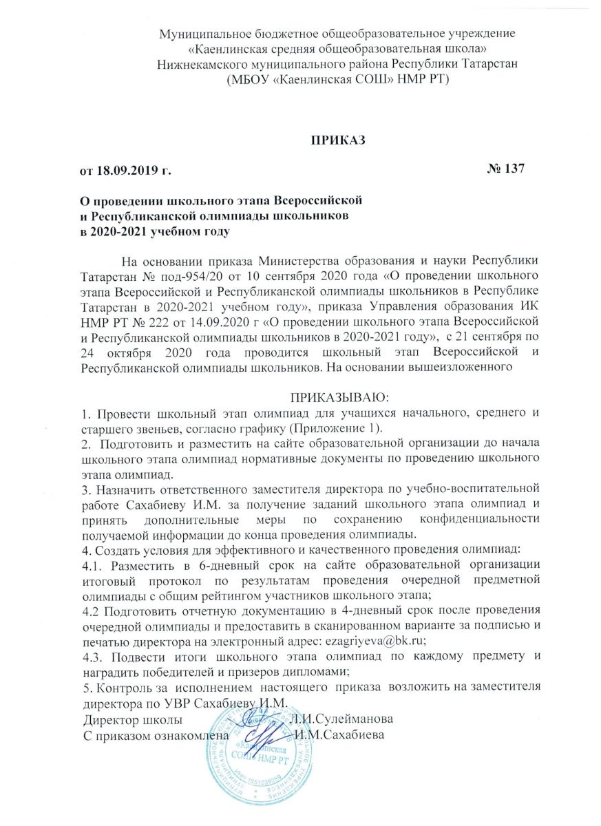 Приказ об итогах проведении школьного этапа Всероссийской и Республиканской олимпиад школьников