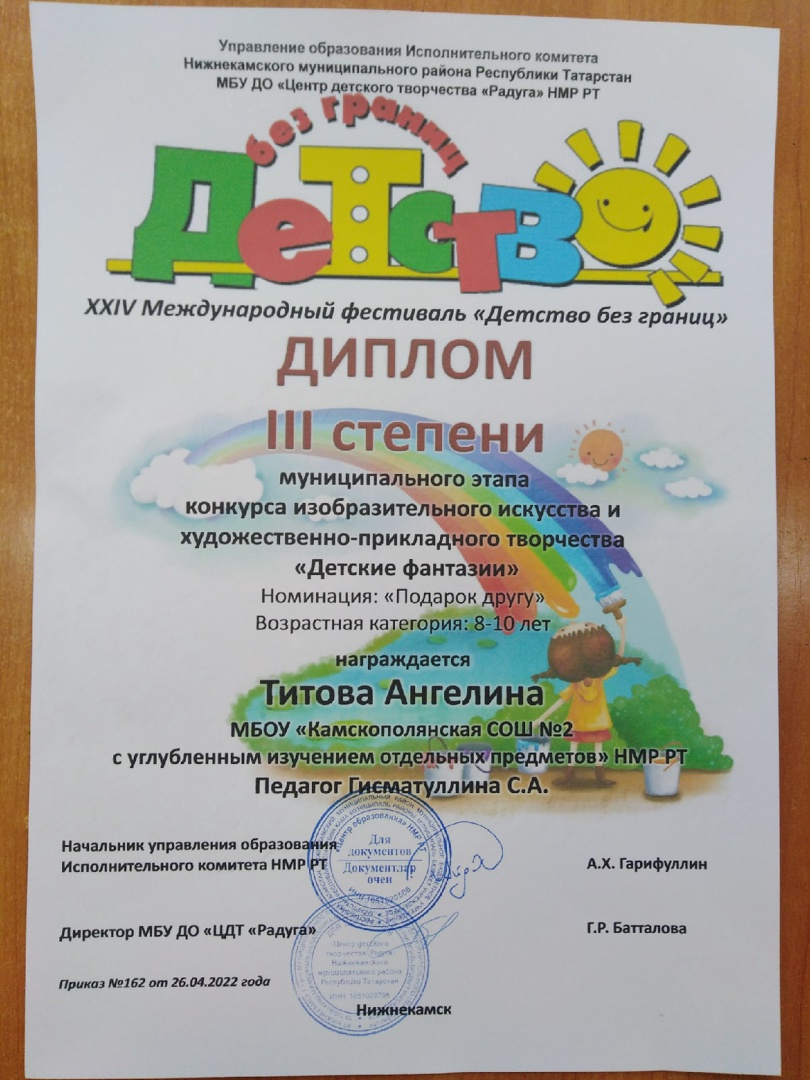 Лауретом IIстепени в Республиканском конкурсе детского творчества стал ученик 7Б класса Сафиуллин Султан (руководитель Хусаинова Э. А.)