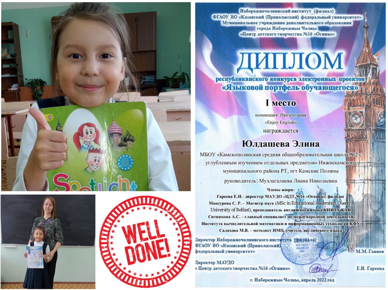 Юлдашева Элина, ученица 3Б класса, победитель Республиканского конкурса электронных проектов "Языковой портфель обучающегося". Умничка! (Учитель Муллагалиева Л.Н.)