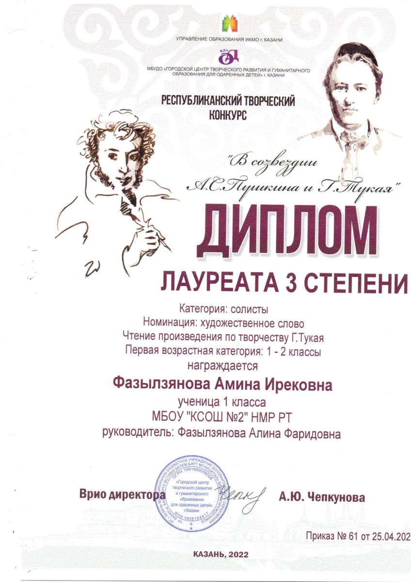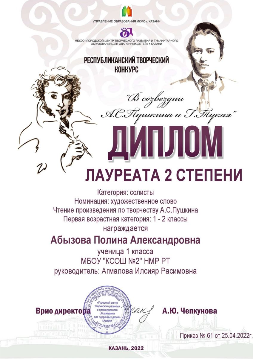 Республиканский творческий конкурс чтецов «В созвездии А.С.Пушкина и Г.Тукая» 25.04.2022