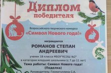 Поздравляем Романова Степана, ученика 1В класса, который стал победителем во Всероссийском творческом конкурсе "Символ Нового года". (Классный руководитель Гисматуллина С. А)