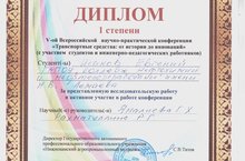 Победа в V-ой Всероссийской научно-практической конференции «Транспортные средства: от истории до инноваций» 22.06.2018