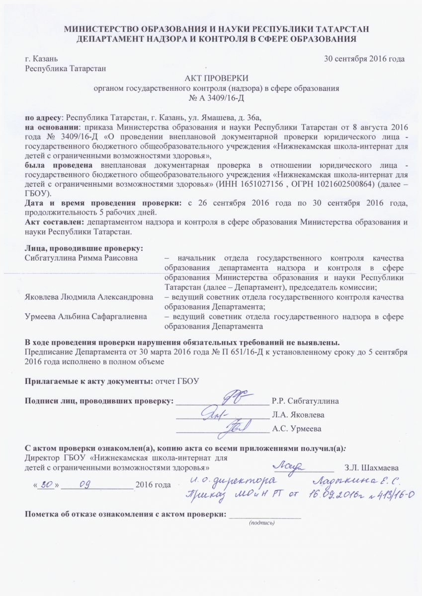 Акт проверки органом государственного контроля № А 3409/16-Д от 30 сентября 2016