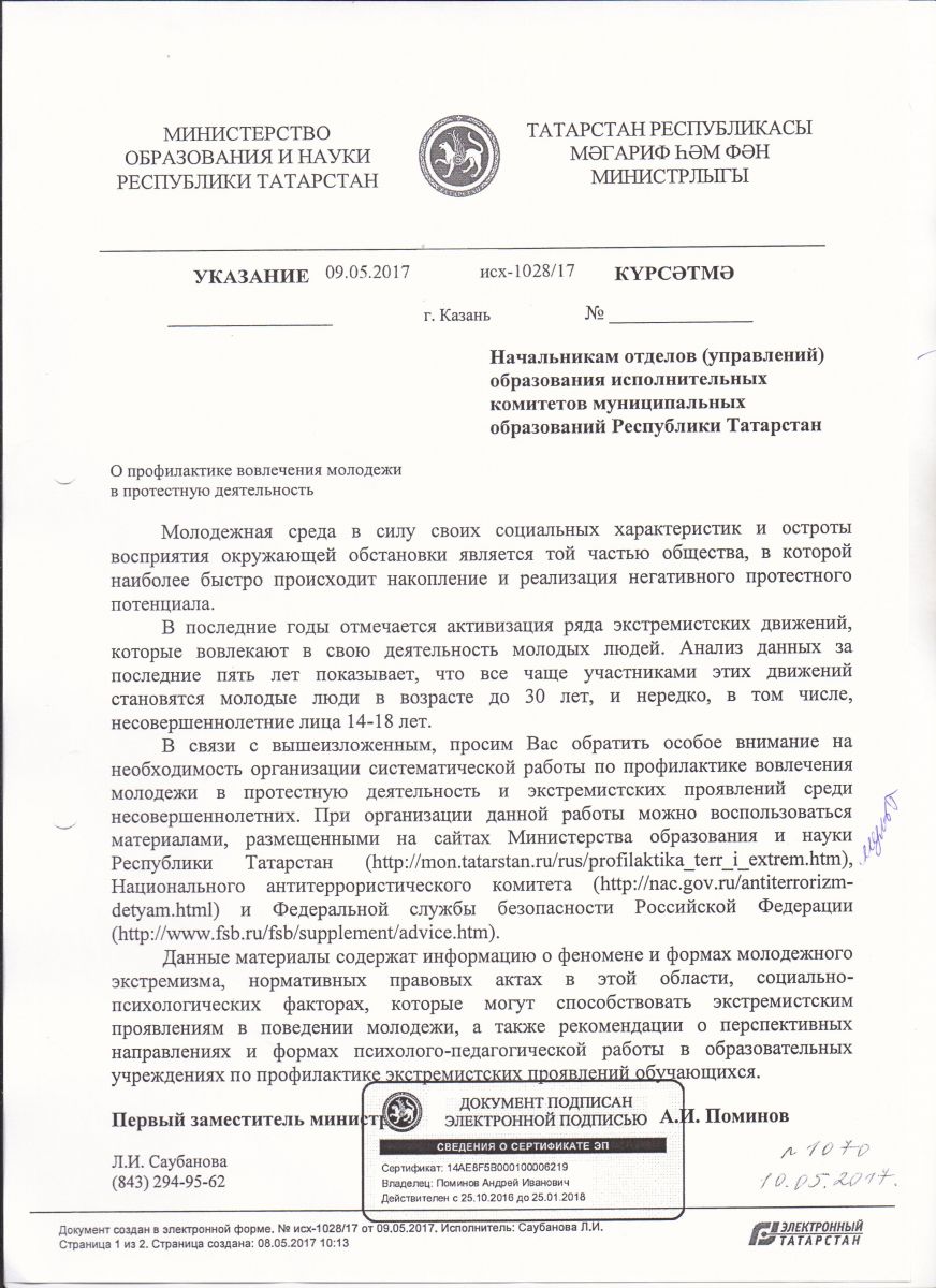 Указание МО 1028 о профилактике вовлечения молодежи в протестную деятельность