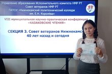 17 апреля обучающаяся 10а класса Бахмина Аделия приняла участие в VIII муниципальной научно-практической конференции "Казаковские чтения". Аделия выступила с исследовательской работой, посвящённой ветерану Великой Отечественной войны, военруку, одному из основателей Совета ветеранов г. Нижнекамск Казанцеву Андрею Ивановичу.