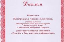 Дипломантом конкурса сочинений "Если бы я был учителем информатики" , организованным научно-практическим журналом "Информатика в школе" стала ученица 9А класса Марданшина Айзиля. Её сочинение будет напечатано в этом журнале! Руководитель - Коновалова Т.Н. Поздравляем с наградой и желаем дальнейших успехов в различных конкурсах!