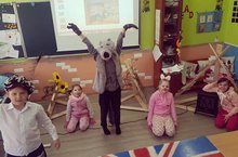 На этой неделе в 3А классе 5 учащихся показали инсценировку сказки "3 поросенка" для других учащихся этого класса на английском языке.