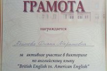 На прошлой неделе ученица 11а класса Абитова Диана со своими одноклассницами участвовала в викторине по английскому языку "British English vs. American English", организованной Казанским инновационным университетом имени В.Г. Тимирясова. И получила грамоту за активное участие! С чем мы ее поздравляем и желаем сдать ЕГЭ на все 100!