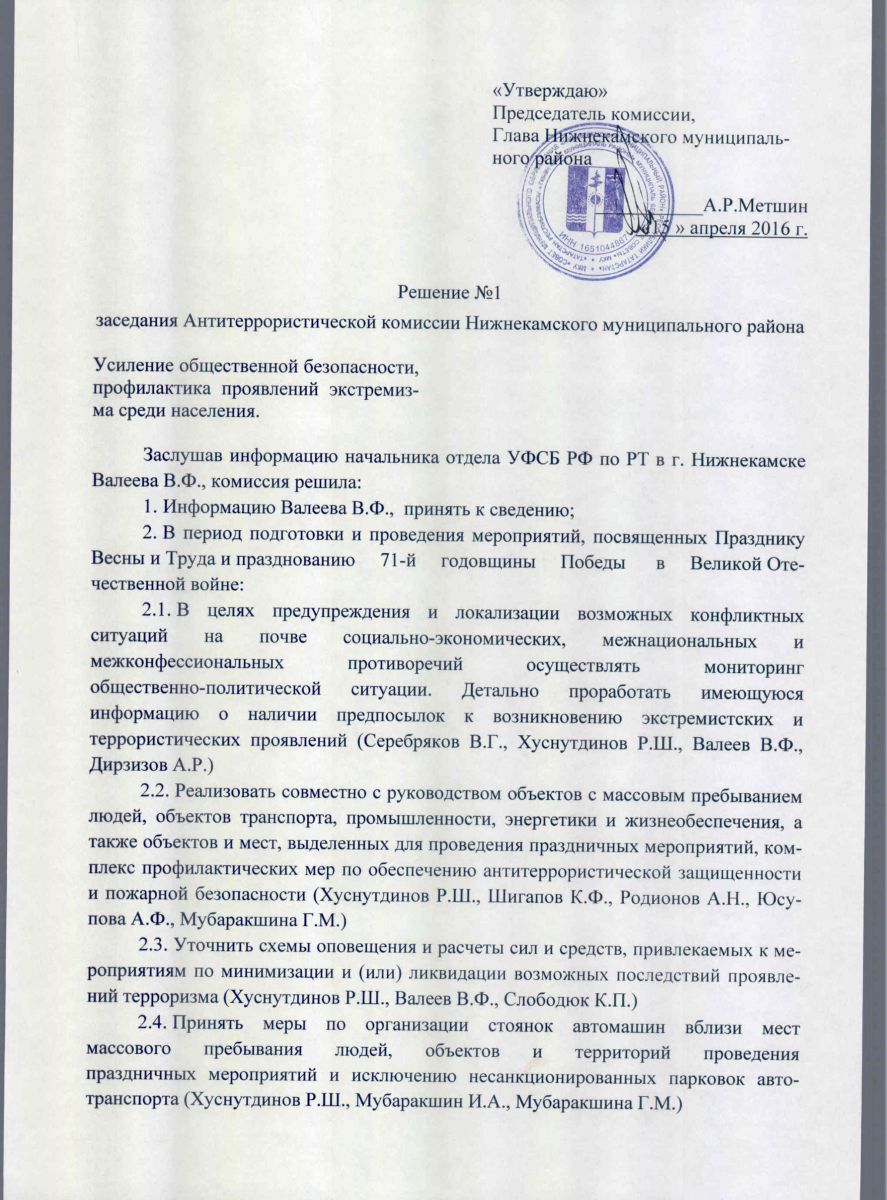 Решение №1 заседания Антитеррористической комиссии Нижнекамского муниципального района от 15 апреля 2016 г. (продолжение)