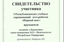 23 марта прошли Первые республиканские соревнования лего-роботов «Первый шаг» среди учащихся 5-8 классов. В конкурсе приняли участие около тридцати команд со всего Татарстана. Среди них были и три команды из Нижнекамска: «Лицеисты» (Лицей-интернат № 24), «Десятка» (Школа № 10) «Ассорти» (смешанная команда этих же двух школ). Все они представляли Центр Детского Творчества им. И.Х. Садыкова.