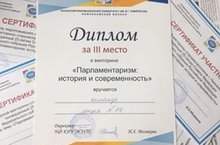 18 мая на базе Нижнекамского филиала Казанского инновационного университета им. В.Г Тимирясова ученики 10 б класса - Ибрагимова Айсылу, Нуриахметова Лилия, Имаев Артур, Давлетшин Айрат, Мирзаханова Адиля, Тян Артур приняли участие в викторине "Парламентаризм: история и современность". За успешное участие они были награждены дипломом! 3 место среди 17 школ города. Гордимся ими и желаем им дальнейших успехов!!!