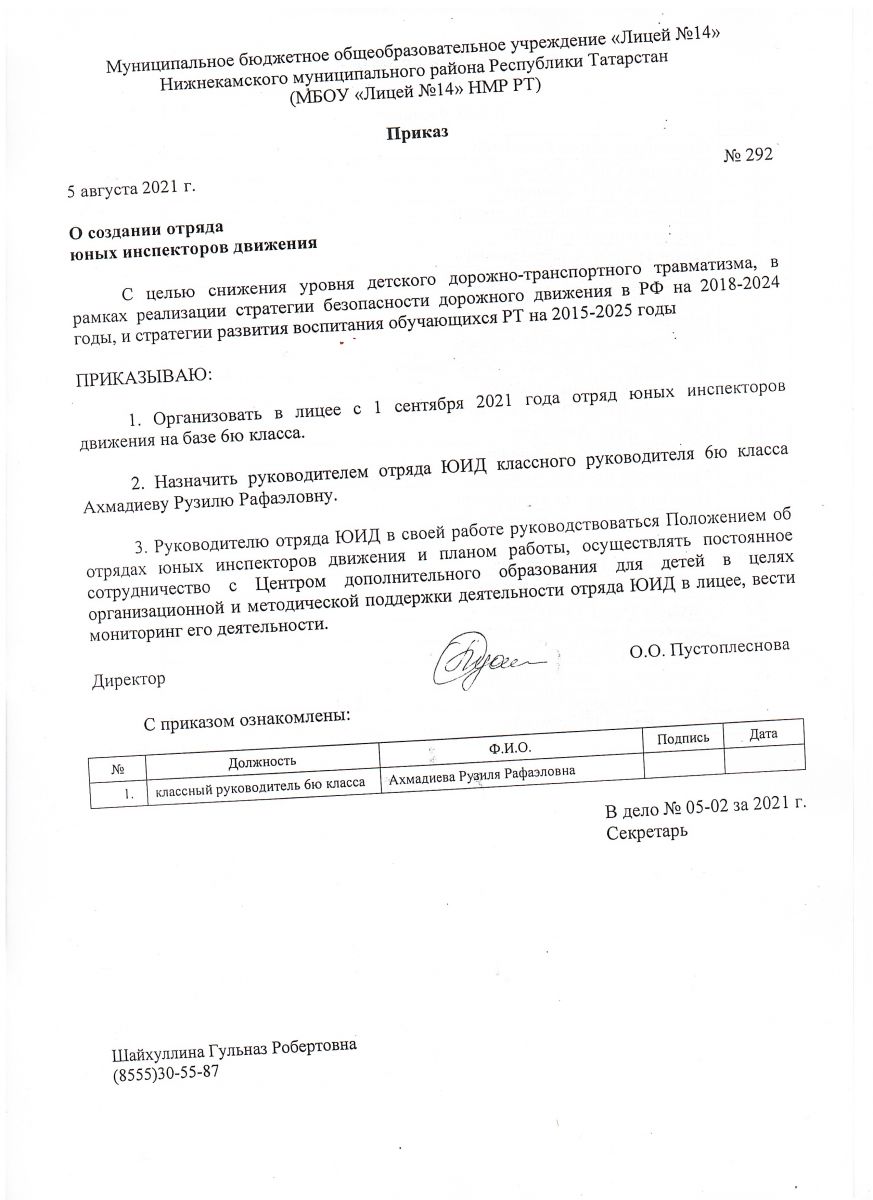 План работы отряда ЮИД МБОУ "Лицей №14" НМР РТ на 2021 - 2022 учебный год