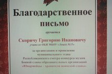 Григорий Иванович Скорич мәгариф оешмаларының "Яшь армиячеләр-хәрби дан сакчылары" Хәрби дан музейлары смотр - конкурсының муниципаль этабын оештырган һәм уздырган өчен Рәхмәт хаты белән бүләкләнде; "Россия патриотларын үстерәбез"IV Республика фәнни-гамәли конференциясенең муниципаль этабын оештырган һәм уздырган өчен Рәхмәт хаты белән бүләкләнде. -