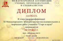 Петров Сергей, ученик 9Д класса принял участие в XI Международном конкурсе научно-исследовательских и творческих работ учащихся "Старт в науке" и получил диплом лауреата. Поздравляем! Руководители: Лукавченко К.М., Галиева Г.И. Желаем вам новых достижений!