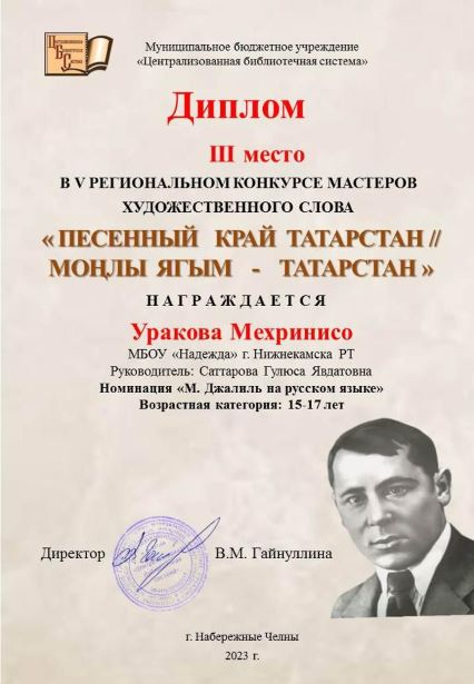Ученица 8 А класса Уракова Мехринисо заняла 3 место в V Региональном конкурсе мастеров художественного слова « Песенный край Татарстан». Желаем ученице крепкого здоровья и творческих успехов.