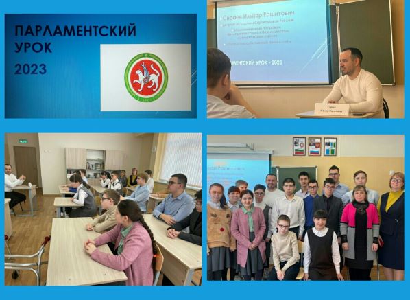 1февраля 2023 года по ежегодной традиции в школе для учащихся 8-10 классов прошел Парламентский урок— 2023 на тему «Мы — граждане России». Депутат от партии «Справедливая Россия», уполномоченный по правам предпринимателей в Нижнекамском муниципальном районе Сираев Ильнар Рашитович в живом диалоге и дискуссии пообщался с ребятами: интересно раскрыл особенности деятельности народных избранников в общественно-политической жизни общества. Мероприятие способствовало формированию