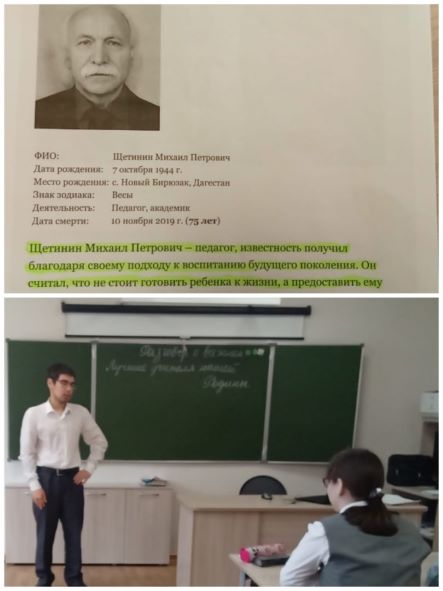 Сегодня в рамках занятий "Разговоры о важном" ученики 10 а класса поделились своими сообщениями о выдающихся педагогах нашей Родины: Сухомлинском В. А., Щетинине, Макаренко, Крупской Н. К., Амоношвили Ш. А. , Соловейчике С. Л. Ребята узнали о том, кто такие педагоги-новаторы, что существуют разные подходы в педагогике и обучении. В конце занятия сделали вывод о значении профессии учителя.