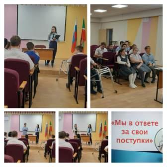 В целях правового просвещения в школе прошел урок «Мы в ответе за свои поступки», на котором инспектор ПДН при администрации города Нижнекамска Л.Н. Миначетдинова — ведущий специалист по профилактике семейного неблагополучия и правонарушений среди несовершеннолетних, ознакомила с понятием правонарушения и видами юридической ответственности, подняла другие важнейшие темы профилактики правонарушений. Урок прошел в форме семинара-практикума, в котором активно участвовали не только обучающиеся, но и учителя.