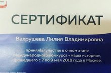 Учитель истории и обществознания Вахрушева Лиля Владимировна приняла участие в очном этапе Международного конкурса "Наша история", который проходил в г. Москва. Педагог приехала с конкурса с массой положительных эмоций, новых знакомств и новых идей работы с учащимися.