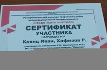 Учащиеся 9 класса под руководством педагогов Хабибуллиной Г.В. и Идиятуллиной Ф.М. Хафизов Равиль и Клянц Иван приняли участие в республиканском конкурсе творческих работ антикоррупционной направленности "Надо жить честно!" . За свою работу обучающиеся получили сертификат. Поздравляем ребят!