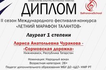 Поздравляем Маркелову Лизу и её педагога по вокалу Чуракову Ларису Анатольевну с заслуженной наградой во II сезоне Международного фестиваля-конкурса «Летний марафон талантов».