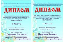 Воспитанницы объединения " Бисероплетение" Скрипина Елизавета и Насырова Валерия награждены дипломом за II место в номинации "Бисероплетение" (педагог Мущинина Е. В.)
