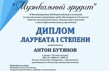 Поздравляем ученика ДМШ №1 Бутянова Антона с лауреатством I степени во II Международной (III Всероссийской) олимпиаде по музыкальной литературе «Музыкальный эрудит»!