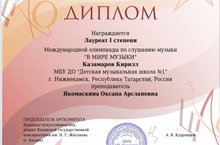 Поздравляем ученика ДМШ №1 Казамарова Кирилла с лауреатством I степени в Международной олимпиаде по слушанию музыки «В МИРЕ МУЗЫКИ»!