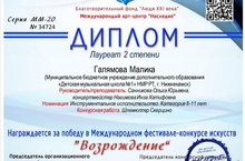 Поздравляем ученицу оркестрового отдела ДМШ №1 Галямову Малику с лауреатством II степени в Международном фестиваль-конкурсе искусств «Возрождение»!
