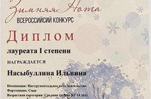 Поздравляем ученицу фортепианного отдела ДМШ №1 Насыбуллину Ильвину с лауреатством I степени во Всероссийском конкурсе «Зимняя нота»!