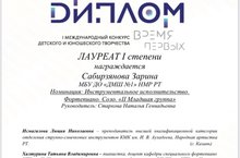 Поздравляем ученицу фортепианного отдела ДМШ №1 Сабирзянову Зарину с лауреатством I степени в I Международном конкурсе детского и юношеского творчества «Время первых»!