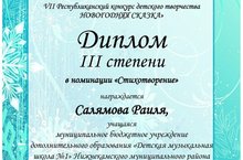В целях сохранения и развития традиционной художественной культуры, повышения интереса к традициям празднования Нового года и Рождества государственным бюджетным учреждением дополнительного образования «Республиканский центр внешкольной работы» совместно с муниципальным бюджетным учреждением дополнительного образования «Детская художественная школа №3» Ново-Савиновского района г. Казани в период с 16 ноября по 31 декабря 2020 года был проведен VII Республиканский конкурс детского творчества «Новогодняя сказка», где ученица Салямова Раиля (рук. Тукеева Юлия Владимировна) заняла 3 место!