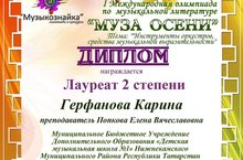 Поздравляем ученицу ДМШ №1 Герфанову Карину с лауреатством II степени в I Международной олимпиаде по музыкальной литературе «Муза осени»!