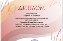 Поздравляем преподавателя оркестрового отдела ДМШ №1 Савинову Елену Викторовну с лауреатством III степени в Международном педагогическом конкурсе «Арт-сценарий»!