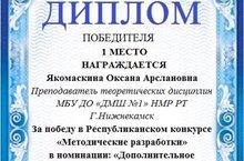 В сентябре 2019 года в городе Чистополь проводился Республиканский конкурс «Методические разработки», где преподаватель ДМШ №1 Якомаскина Оксана Арслановна стала обладателем диплома Победителя I степени!