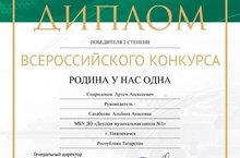 В августе 2019 года Академия народной энциклопедии проводила Всероссийский конкурс «Родина у нас одна» в рамках реализации Общероссийского инновационного проекта «Моя Россия», где ученик ДМШ №1 Спиридонов Артём стал обладателем диплома Победителя II степени!