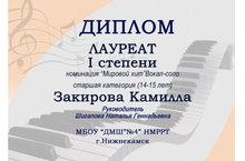 13 ноября 2020г. в г.Казань прошел Всероссийский детский фестиваль «Нотная симфония» где учащаяся МБУ ДО «ДМШ № 4» НМР РТ Закирова Камилла стала Лауреатом I степени в номинации «Мировой хит «Нотная симфония».
