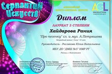 Поздравляем учащуюся вокального отдела "Детской музыкальной школы №5" Хайдарову Ранию (кл.преп-ля Росляковой Ю.В), которая отлично выступила и стала Лауреатом III степени во Всероссийском конкурсе-фестивале искусств "Серпантин искусств" г.Севастополь.